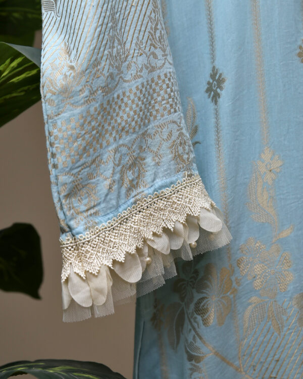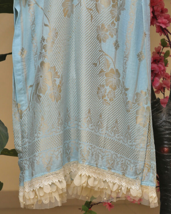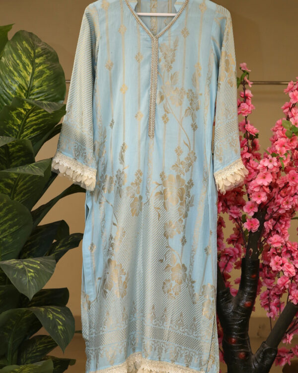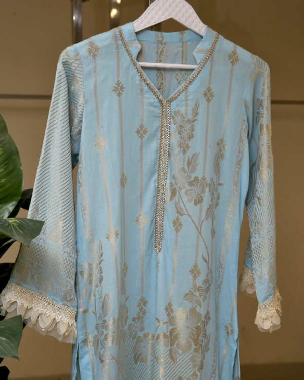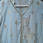 Elevate your style with our exquisite light blue kurta adorned with delicate golden light embroidery. This elegant piece seamlessly blends traditional charm with modern flair, making it a versatile addition to your wardrobe. Crafted with precision, the intricate embroidery adds a touch of sophistication, making this kurta perfect for both casual and festive occasions. The soothing light blue hue enhances its timeless appeal, ensuring you stand out with grace and poise. Embrace the fusion of tradition and contemporary fashion with this enchanting light blue kurta.